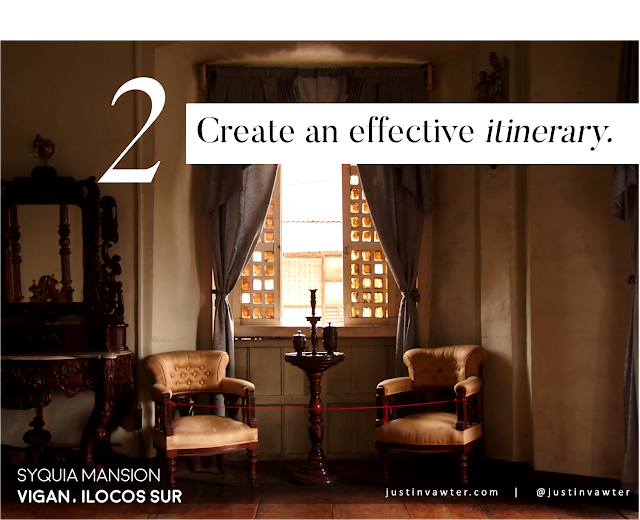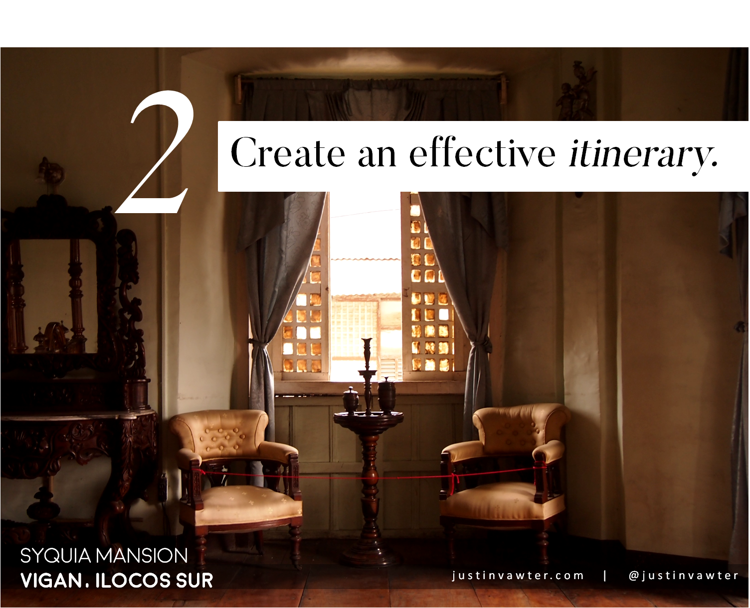 Writing an itinerary is more than just jotting down the estimated time and sequence of events. It involves critical thinking, assessment and a lot of considerations. What I usually do is list down the places I find interesting during my research stage and arrange them accordingly based on their distance and nature. It is very important to consider nature and time when arranging your itinerary. You should think the best time to go to. For example: I always go to church at noon so I can have the place to myself. Plus, it helps me fight the heat outside. Go indoors from around 1-3pm to avoid extreme heat (you don’t wanna look haggard immediately!). If you’ll visit open spaces like parks and beach fronts, best time is around 4-6pm just in time for the golden hour and sunset. The temperature has already cooled down and the colors are perfect for photos. These small considerations can have a huge impact on your travel experience. Also, make sure to arrange them based on distance so you can save money for transpo.